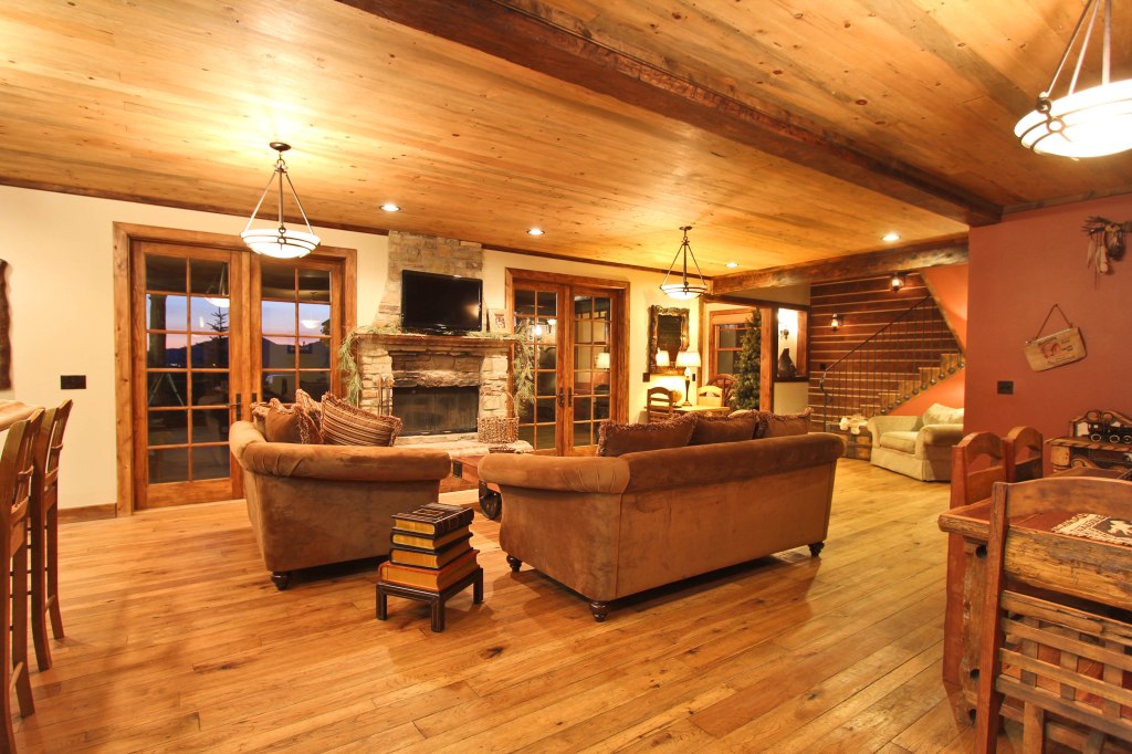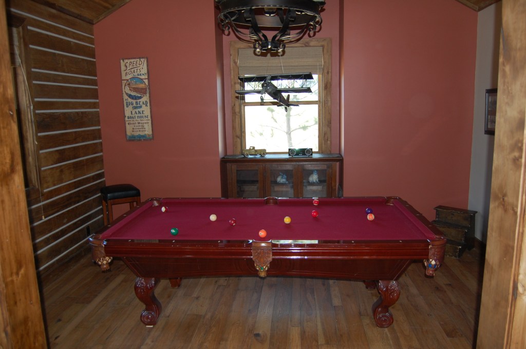 The Living Room offers plenty of dining and seating space, as well as a cozy wood-burning fireplace. We’ve added a Pool Room just off to the side.