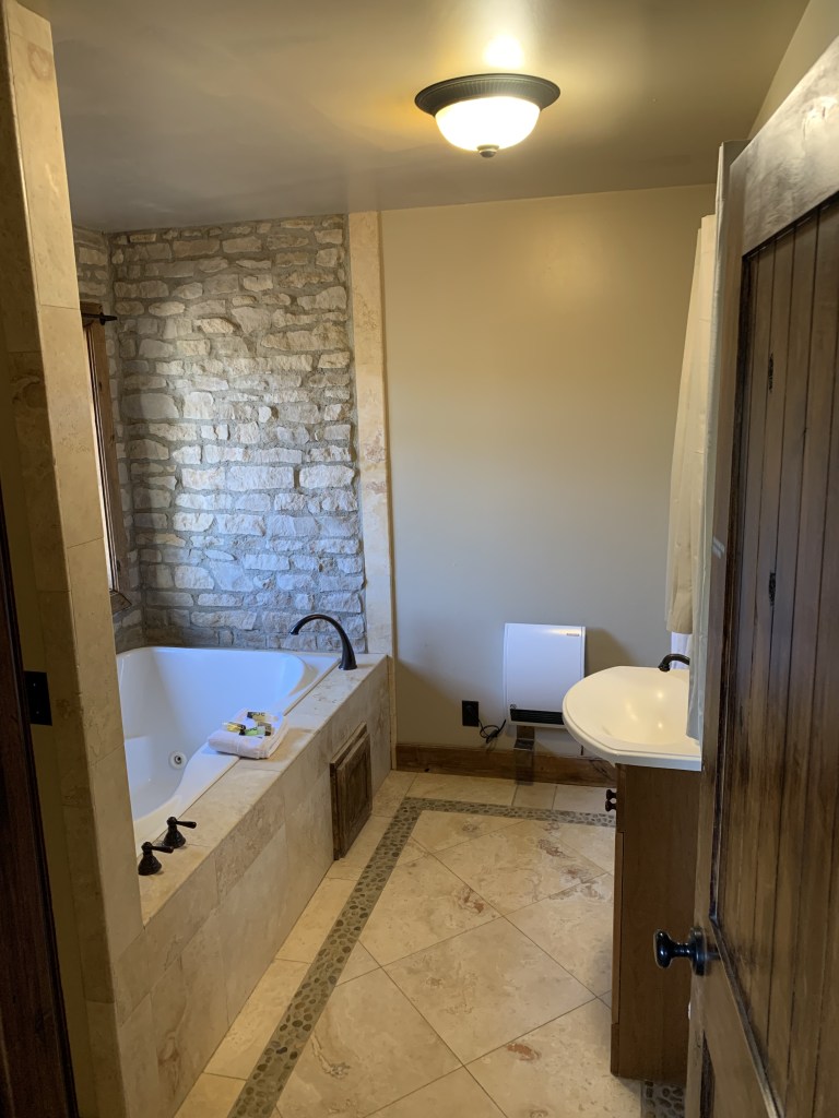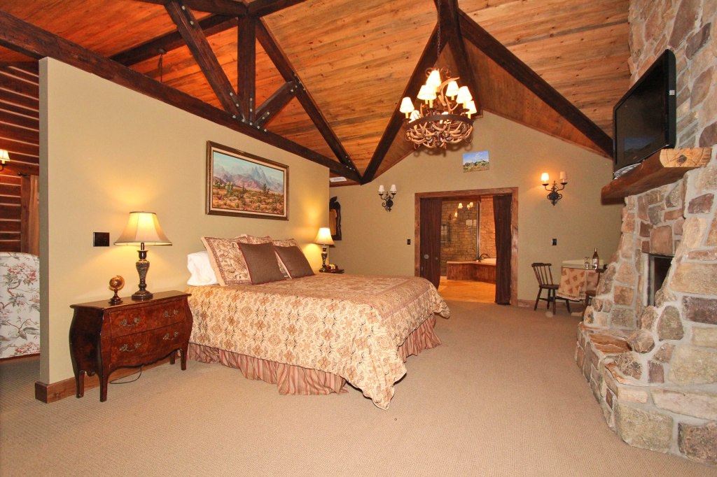 The Main House features a large and luxurious upstairs Master Bedroom with two king size beds separated by a privacy wall, a wood-burning fireplace and a queen sleeper sofa. The enormous Master Bath offers a whirlpool tub and oversized shower.